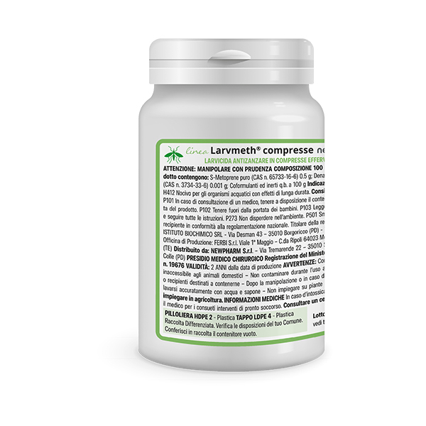 LARVMETH® COMPRESSE è un larvicida in compresse effervescenti. È estremamente efficace contro tutte le specie di zanzare (compresa la Zanzara Tigre). LARVMETH® COMPRESSE esplica la sua azione per ingestione e contatto, mimando l’effetto dell’ormone giovanile che impedisce alla larva di trasformarsi e diventare adulto. Se impiegato nei tempi e nelle modalità corrette, presenta una certa selettività verso i predatori e gli iperparassiti.
